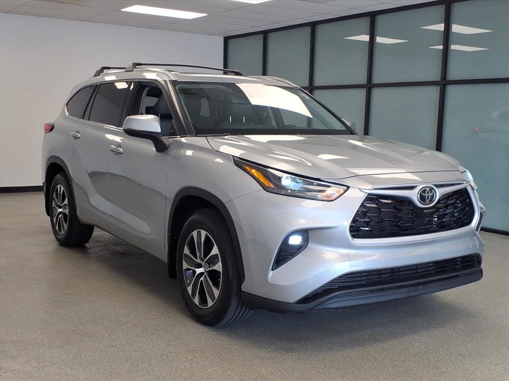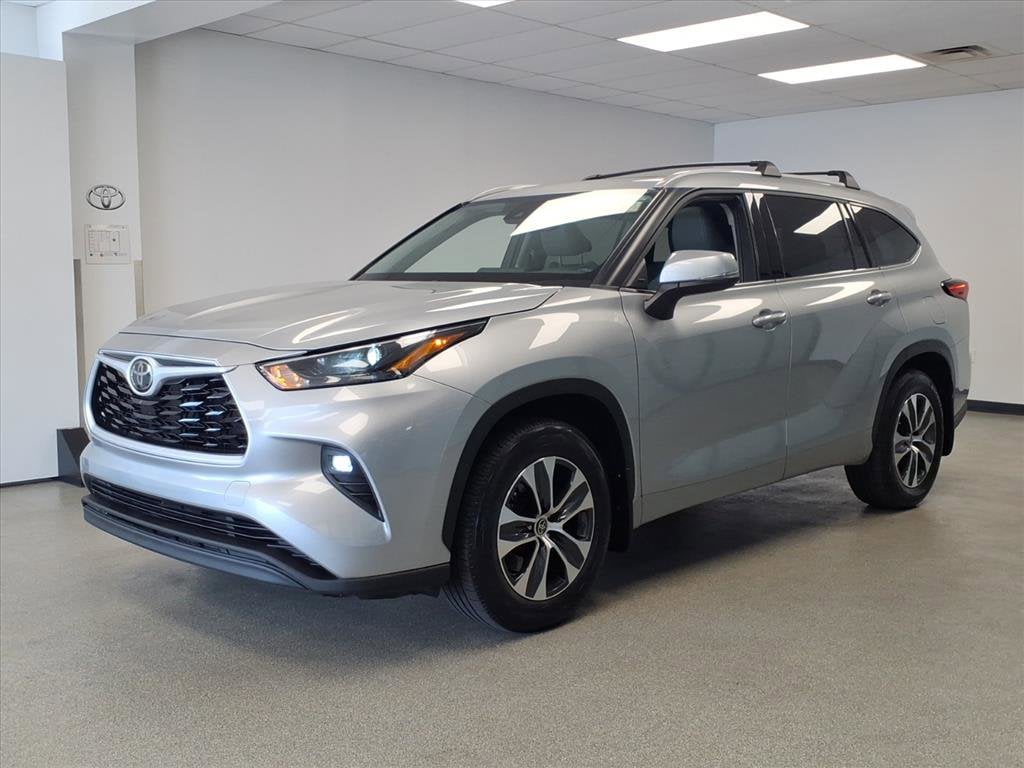 Proudly serving Cincinnati, Florence, Alexandria, Dayton, Hamilton, Dry Ridge, Lexington, Louisville, Nicholasville. Certified. Celestial Silver Metallic 2022 Toyota Highlander XLE AWD 8-Speed Automatic 3.5L V6 DOHC 6 Speakers, Alloy wheels, AM/FM radio: SiriusXM, Apple CarPlay/Android Auto, Auto High-beam Headlights, Auto-dimming Rear-View mirror, Brake assist, Bumpers: body-color, Cargo Cover (TMS), Cargo Cross Bars (TMS), Delay-off headlights, Door Edge Guards (TMS), Electronic Stability Control, Emergency communication system: Safety Connect with 1-year trial, Exterior Parking Camera Rear, Front fog lights, Fully automatic headlights, Heated door mirrors, Heated Front Bucket Seats, Heated front seats, Knee airbag, Leather Shift Knob, Panic alarm, Passenger door bin, Power door mirrors, Power Liftgate, Power moonroof, Radio: Audio Plus, Radio: Premium Audio w/Navigation, Rear window wiper, Roof rack: rails only, Security system, Speed control, Spoiler, Tow Hitch (TMS), Traction control, Turn signal indicator mirrors, Variably intermittent wipers, Wheels: 18" Machined-Finish Alloy.