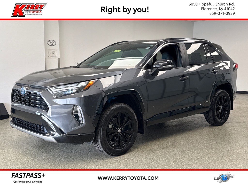 Proudly serving Cincinnati, Florence, Alexandria, Dayton, Hamilton, Dry Ridge, Lexington, Louisville, Nicholasville. Certified. Magnetic Gray Metallic/Midnight Black Metallic 2024 Toyota RAV4 Hybrid XSE AWD eCVT 2.5L 4-Cylinder 6 Speakers, Alloy wheels, AM/FM radio: SiriusXM, Auto High-beam Headlights, Auto-dimming Rear-View mirror, Brake assist, Bumpers: body-color, Delay-off headlights, Electronic Stability Control, Emergency communication system: Safety Connect (1-year trial), Exterior Parking Camera Rear, Fully automatic headlights, Garage door transmitter: HomeLink, Heated door mirrors, Heated Front Seats, Heated front seats, Knee airbag, Leather Shift Knob, Leather steering wheel, Mudguards (TMS), Panic alarm, Passenger door bin, Power door mirrors, Power Liftgate, Power moonroof, Radio data system, Radio: AM/FM/XM Audio System, Rear window wiper, Security system, Speed control, Spoiler, Traction control, Turn signal indicator mirrors, Variably intermittent wipers, Wheels: 18" x 7.0J Black-Painted Aluminum Alloy.