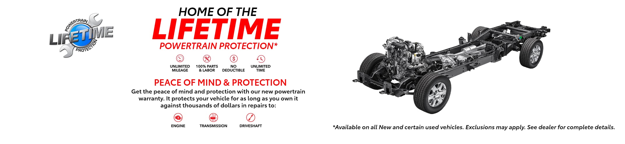 We are also extremely proud to offer everyone who purchases a new or used vehicle at Kerry Toyota with our exclusive Lifetime Powertrain Loyalty Program.When you purchase a new, Toyota Certified used, or quality pre-owned vehicle from Kerry Toyota not only will you have the peace of mind from the applicable manufacturer's warranty, but you'll also have Kerry Toyota protecting your vehicle's powertrain for the entire time in which you own it.