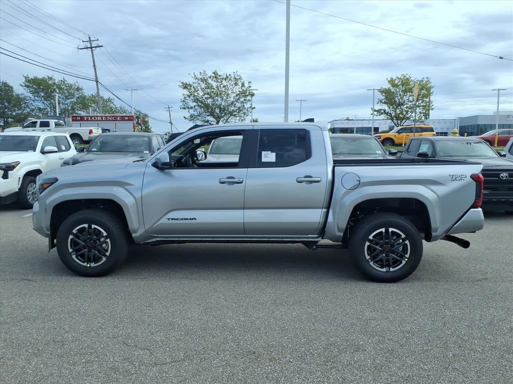 Celestial Silver Metallic 2025 Toyota Tacoma TRD Sport 4WD 8-Speed Automatic 2.4L 4-Cylinder 6 Speakers, All Weather Floor Liners (TMS), Alloy wheels, AM/FM radio: SiriusXM, Apple CarPlay/Android Auto, Auto High-beam Headlights, Auto-dimming Rear-View mirror, Brake assist, Bumpers: body-color, Electronic Stability Control, Emergency communication system: Safety Connect (1-year trial), Exterior Parking Camera Rear, Front fog lights, Fully automatic headlights, Heated door mirrors, JBL Premium Audio, Knee airbag, Leather Shift Knob, Leather steering wheel, Panic alarm, Passenger door bin, Power door mirrors, Radio: 8" Toyota Audio Multimedia, Rear step bumper, Security system, Speed control, Traction control, Turn signal indicator mirrors, Variably intermittent wipers, Wheel Locks (TMS), Wheels: 18" TRD Sport Alloy.