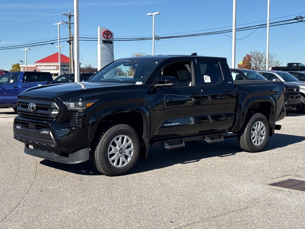 Black 2025 Toyota Tacoma SR5 RWD 8-Speed Automatic 2.4L 4-Cylinder 6 Speakers, All Weather Floor Liners (TMS), Alloy wheels, AM/FM radio: SiriusXM, Apple CarPlay/Android Auto, Auto High-beam Headlights, Auto-dimming Rear-View mirror, Bed Step (TMS), Black Chrome Exhaust Tip (TMS), Brake assist, Bumpers: body-color, Door Edge Guard (TMS), Driver door bin, Electronic Stability Control, Emergency communication system: Safety Connect (1-year trial), Exterior Parking Camera Rear, Front fog lights, Front reading lights, Fully automatic headlights, Heated door mirrors, Illuminated entry, IP Side Accessory - LED Lantern (TMS), Knee airbag, Mudguards (TMS), Outside temperature display, Overhead console, Panic alarm, Passenger door bin, Power door mirrors, Predator Step (TMS), Radio: 8" Toyota Audio Multimedia, Rear step bumper, Speed control, Traction control, Variably intermittent wipers, Wheel Locks (TMS), Wheels: 17" Styled Alloy.