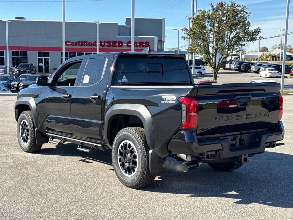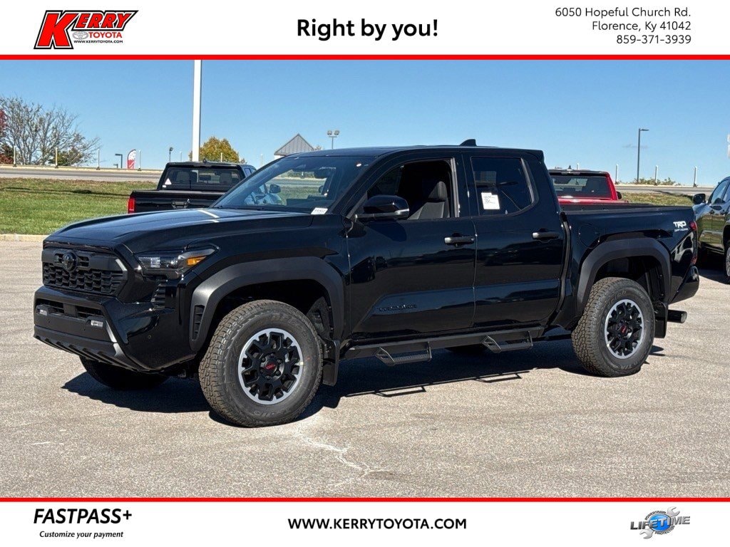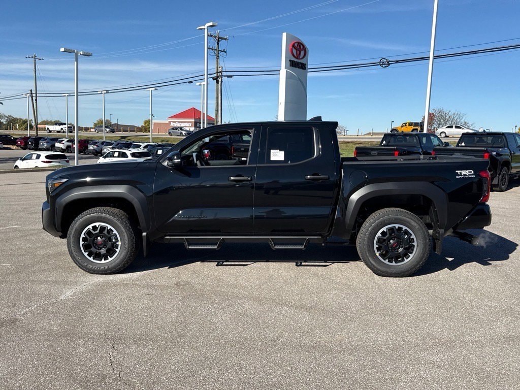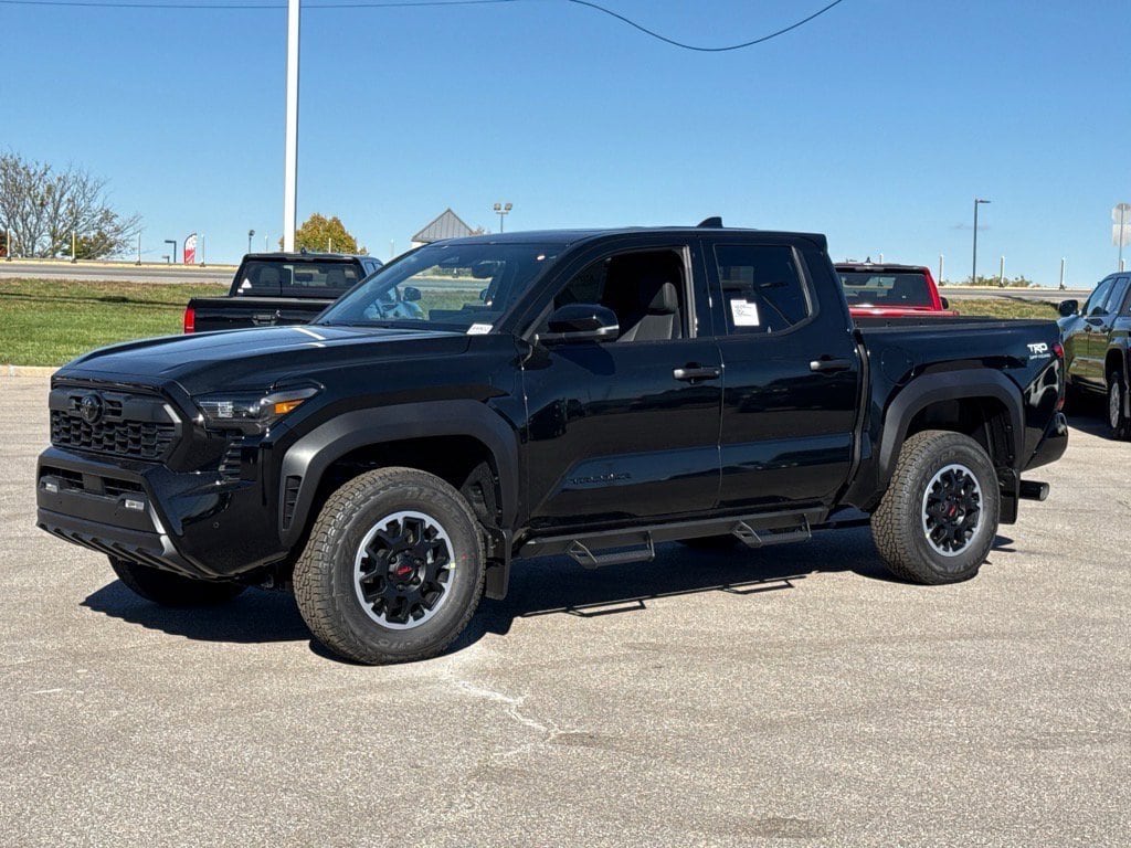 Black 2025 Toyota Tacoma TRD Off-Road 4WD 8-Speed Automatic 2.4L 4-Cylinder 120V/400W AC Power Inverter, 3D Multi-Terrain Monitor, 6 Speakers, 8-Way Power Driver & Passenger Seat Adjusters, Alloy wheels, AM/FM radio: SiriusXM, Auto High-beam Headlights, Bed Step (TMS), Black Chrome Exhaust Tip (TMS), Brake assist, Bumpers: body-color, Deck Storage Box, Digital Rearview Mirror, Door Edge Guard (TMS), Electronic Stability Control, Emergency communication system: Safety Connect (1-year trial), Exterior Parking Camera Rear, Front fog lights, Fully automatic headlights, Heated door mirrors, Heated Front Seats, Heated Leather-Trimmed Steering Wheel, Illuminated Front Emblem Dark Chrome (TMS), Integrated Trailer Brake Controller, IP Side Accessory - LED Lantern (TMS), JBL Premium Audio, Knee airbag, Leather Shift Knob, Leather steering wheel, Low Auxiliary (30A) Switches, Mudguards (TMS), Panic alarm, Passenger door bin, Power Horizontal Rear Window, Power Tilt/Slide Moonroof w/Sliding Sunshade, Pre-Wire Accommodation (Bed Power Port), Predator Step (TMS), Radio: 14" Toyota Audio Multimedia w/TRD Premium, Radio: 8" Toyota Audio Multimedia, Rear step bumper, Security system, Smart Key w/Digital Key Technology, Speed control, Spray-On Bed Liner (TMS), TACOMA Stamped Power Open & Close Tailgate, Towing Hitch, Towing Package, Traction control, TRD Off Road Premium Package, Turn signal indicator mirrors, Variably intermittent wipers, Wheel Locks (TMS), Wheels: 17" TRD Off-Road Alloy.