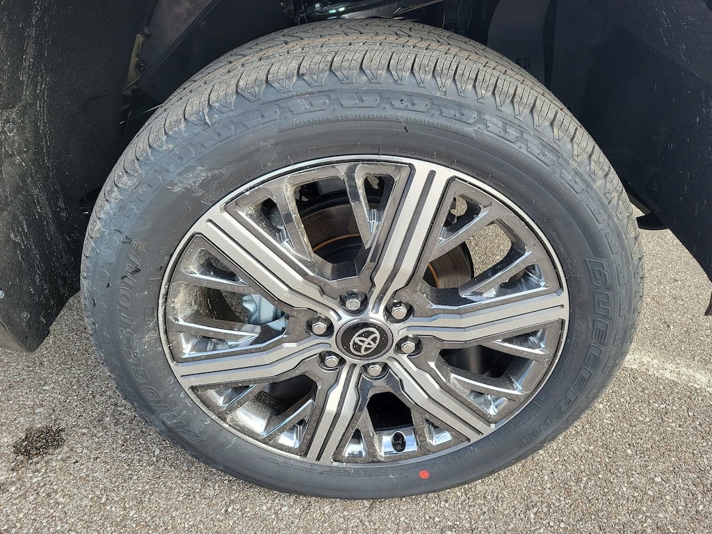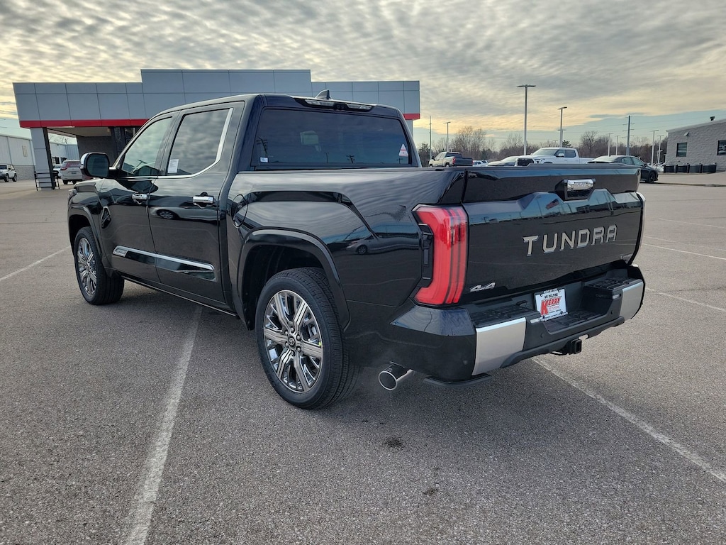 Midnight Black Metallic 2026 Toyota Tundra Hybrid Capstone 4WD 10-Speed Automatic 3.4L V6 12 Speakers, All Weather Floor Liners, Alloy wheels, AM/FM radio: SiriusXM, Apple CarPlay/Android Auto, Auto High-beam Headlights, Auto-dimming door mirrors, Auto-dimming Rear-View mirror, Brake assist, Bumpers: body-color, Compass, Dash Cam, Delay-off headlights, Electronic Stability Control, Emergency communication system: Safety Connect (up to 10-year trial subscription), Exterior Parking Camera Rear, Front fog lights, Fully automatic headlights, Garage door transmitter: HomeLink, Heads-Up Display, Heated and Ventilated Front Bucket Seats, Heated door mirrors, Heated front seats, Heated rear seats, Heated steering wheel, Knee airbag, Leather Shift Knob, Leather steering wheel, Low tire pressure warning, Navigation system: Drive Connect Cloud Navigation (1-year trial subscription), Panic alarm, Passenger door bin, Power door mirrors, Power moonroof, Radio data system, Radio: Premium Audio with JBL, Rain sensing wipers, Rear step bumper, Security system, Speed control, Speed-Sensitive Wipers, Stainless Steel Door Edge Guards, Traction control, Turn signal indicator mirrors, Variably intermittent wipers, Wheel Locks, Wheels: 22" Dark Chrome Alloy.