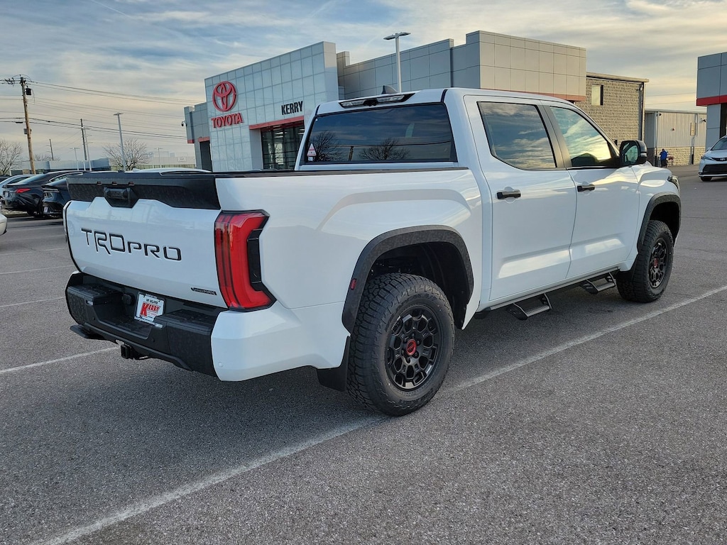 Ice Cap 2026 Toyota Tundra Hybrid TRD Pro 4WD 10-Speed Automatic 3.4L V6 12 Speakers, Alloy wheels, AM/FM radio: SiriusXM, Apple CarPlay/Android Auto, Auto High-beam Headlights, Auto-dimming door mirrors, Auto-dimming Rear-View mirror, Bed Step, Brake assist, Bumpers: body-color, Dash Cam, Delay-off headlights, Electronic Stability Control, Emergency communication system: Safety Connect (up to 10-year trial subscription), Exterior Parking Camera Rear, Front fog lights, Fully automatic headlights, Garage door transmitter: HomeLink, Heated and Ventilated Front Bucket Seats, Heated door mirrors, Heated front seats, Knee airbag, Leather Shift Knob, Leather steering wheel, Low tire pressure warning, Navigation system: Drive Connect Cloud Navigation (1-year trial subscription), Panic alarm, Passenger door bin, Power moonroof, Predator Drop Step, Radio data system, Radio: Premium Audio with JBL, Rear step bumper, Security system, Speed control, Stainless Steel Door Edge Guards, Traction control, TRD PRO Black Bed Lettering, TRD Pro Package, Turn signal indicator mirrors, Variably intermittent wipers, Wheel Locks, Wheels: 18" Black Forged Aluminum BBS.